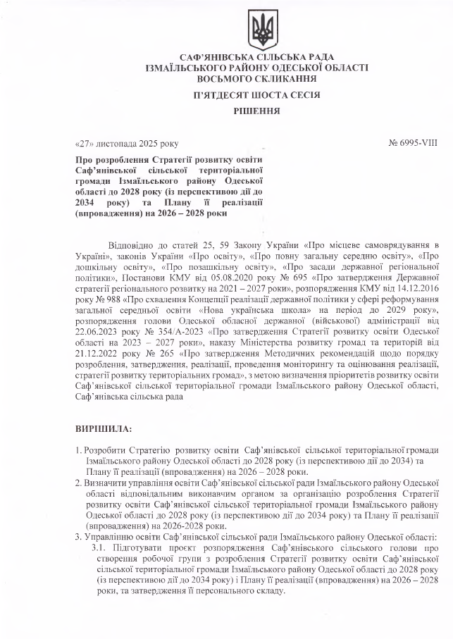 Про розроблення Стратегії розвитку освіти Саф’янівської сільської територіальної громади Ізмаїльського району Одеської області до 2028 року (із перспективою дії до 2034 року) та Плану її реалізації (впровадження) на 2026 - 2028 роки